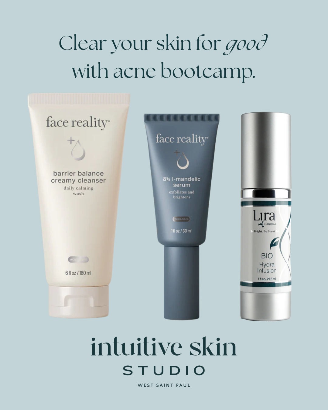 To get started on your clear skin journey at Intuitive Skin Studio simply book the Acne Bootcamp Intro. $50 of you initial investment will go towards the purchase of your skincare routine on the day of your treatment.